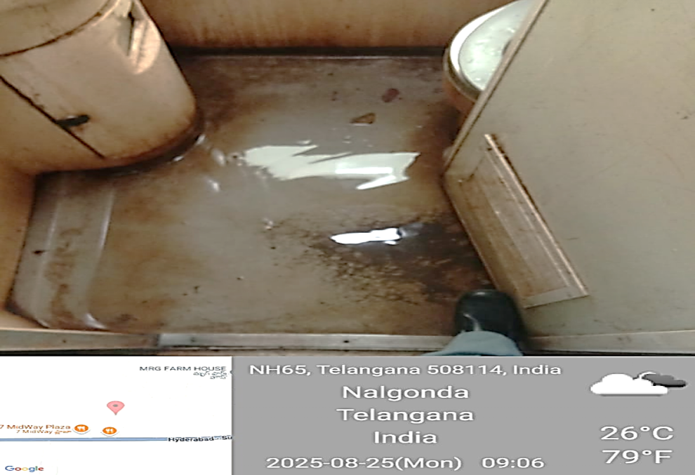 Recently, on 24th. August, 2025 – the correspondent was travelling to Secunderabad Junction on board S1 compartment of 12703: Howrah – Secunderabad Falaknama Express, accompanying his better-half, vide PNR No: 6928789771. Immediately upon boarding the train at 07.55 hours, it was found that the lavatory was extremely dirty. A request, to clean the same, was pledged with the janitor staff who, assured to comply with after the train leaves after 08.30 hours. As a frequent traveller the correspondent is versed with the on-board cleaning services, and thus refrains from drinking fluids to avoid visiting the lavatories.