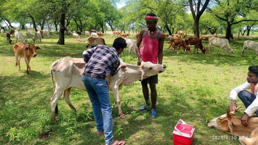 Raipur : A veterinary camp was organized by the Animal Husbandry Department to vaccinate livestock against lumpy disease. During the camp, cattle underwent health check-ups, and 120 animals were vaccinated against lumpy disease. Additionally, 30 animals were given deworming treatment, one case of artificial insemination was carried out, and medicines were distributed to 11 animals.