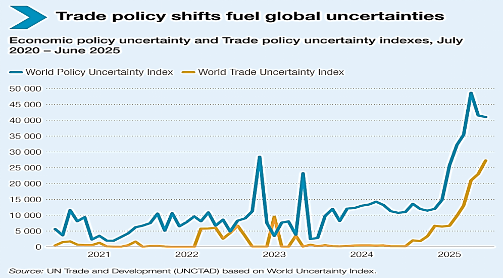 Sept 2025 : Global trade is being reshaped not just by tariffs or geopolitical tensions but also by policy unpredictability. The uncertainty is driving up costs, rattling markets and hitting developing economies hardest. Global trade has always encountered impedances from tariffs to pandemics to geopolitical rifts. What is different now is that uncertainty itself has become systemic. No longer tied to one-off events, policy unpredictability is increasingly built into the global economy, reshaping trade flows and slowing investment. The latest Global Trade Update by UN Trade and Development (UNCTAD) shows how this climate of uncertainty is raising costs, unsettling financial markets and deepening divides between countries.