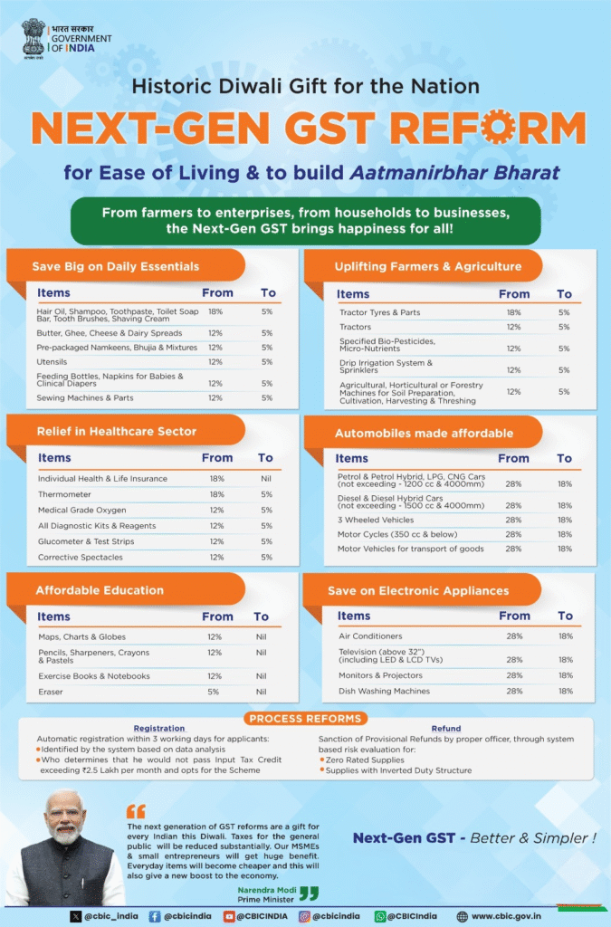 - Supporting Aatmanirbhar Bharat: Lower rates on domestic manufacturing and agriculture inputs will strengthen India’s self-reliance and export competitiveness.