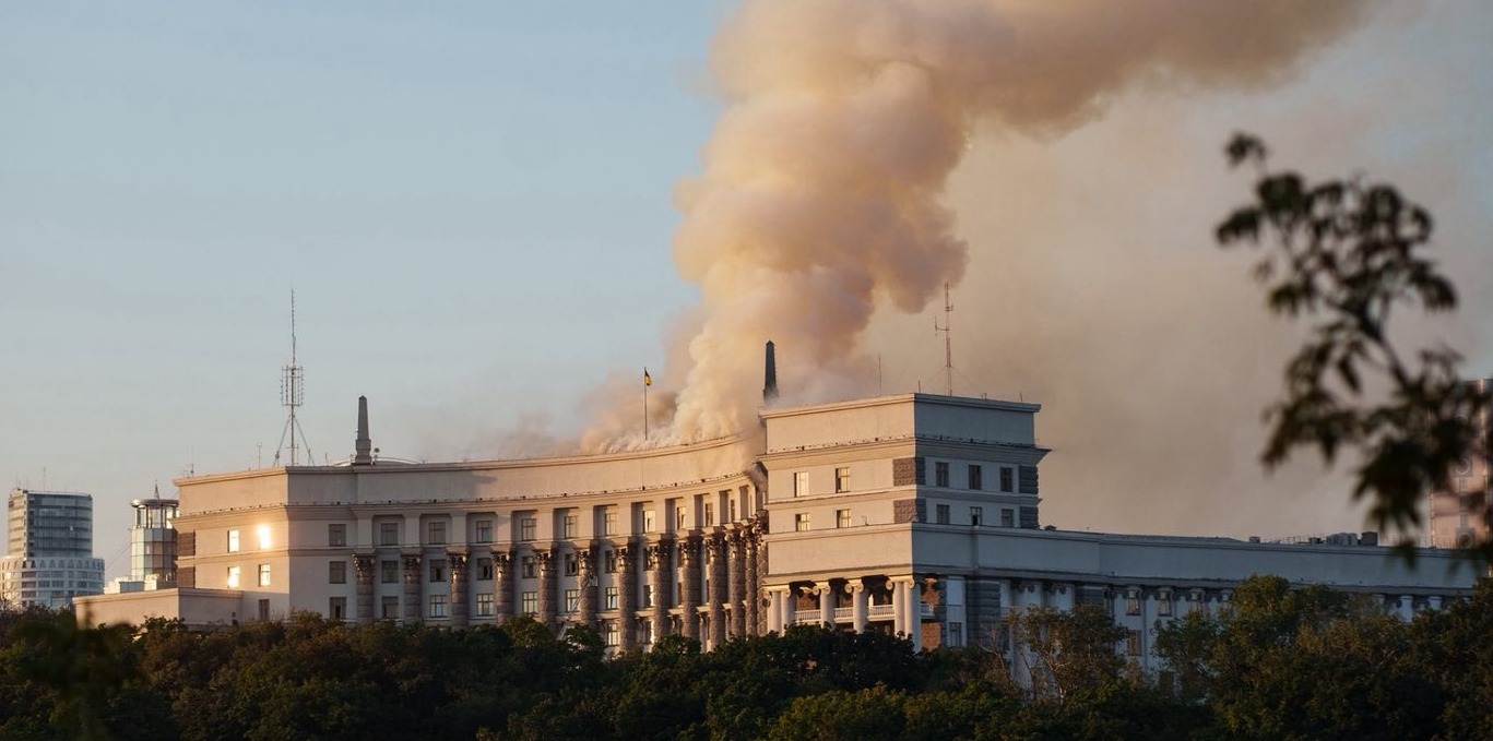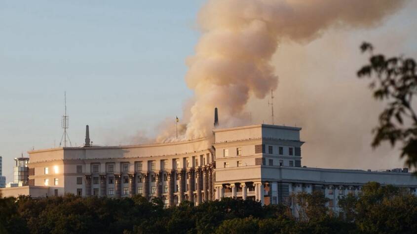 Prime Minister Yulia Svyrydenko said the overnight barrage set fire to the government headquarters in the capital’s historic Pecherskyi district, damaging its roof and upper floors. “For the first time, the government building was damaged by an enemy strike — its roof and upper floors,” she said on Telegram. “Rescuers are extinguishing the fire.”