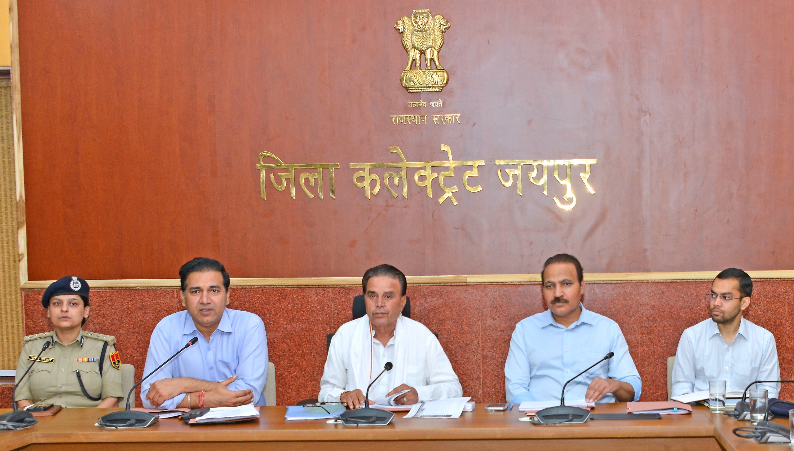 The review meeting was attended by District Collector Dr. Jitendra Kumar Soni, Superintendent of Police Ms. Rashi Dogra, Jaipur Heritage Municipal Commissioner Ms. Nidhi Patel, Jaipur Greater Municipal Commissioner Mr. Gaurav Saini, CEO Ms. Pratibha Singh, Traffic Police Officer Mr. Sumit Mehrada, and Additional District Collectors Mr. Gopal Singh Shekhawat, Mr. Santosh Meena, Mr. Mukesh Kumar Mund, Mr. Devendra Kumar Jain, and Mr. Gopal Parihar, along with senior officials from JDA, Municipal Corporations, Zila Parishad, Police, RIICO, Tourism, NHAI, Animal Husbandry, IT, Education, Health, PWD, JVVNL, Cooperatives, and other departments.