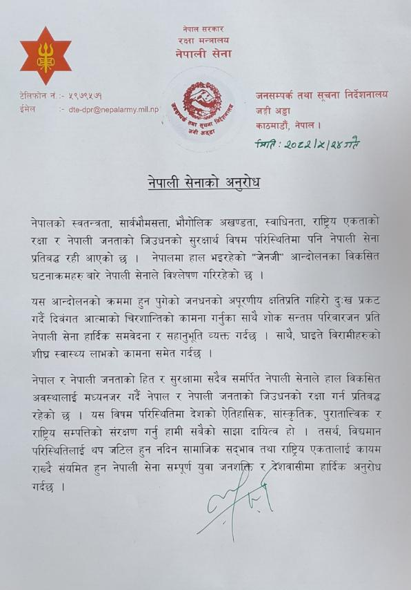 Army chief General Ashok Raj Sigdel appeared on national television late Tuesday, urging calm. “To provide the nation with a peaceful resolution, we urge all groups involved in the protest to call it off and engage in dialogue,” he said.