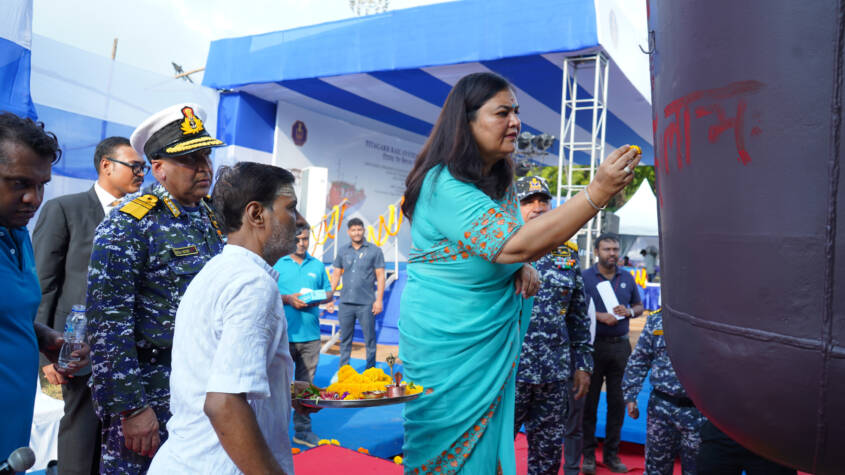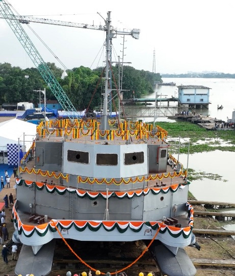 Delhi, Sept 2025 : The launch of ‘DSC A 22’ the third ship of 05 x Diving Support Craft (DSC) project, being built by M/s Titagarh Rail Systems Ltd (TRSL), Kolkata for Indian Navy, was undertaken on 12 Sep 2025 at Titagarh, Kolkata (WB). The Launch Ceremony was presided over by Vice Admiral Suraj Berry, Commander-in-Chief. In keeping with the Naval maritime tradition, Mrs Kangana Berry launched the ship.