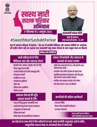 On 17th September 2025, Prime Minister Shri Narendra Modi will launch the ‘Swasth Nari, Sashakt Parivar Abhiyaan’ along with the 8th Poshan Maah, marking a historic step towards strengthening healthcare and nutrition services for women, adolescent girls, and children across India.