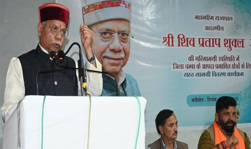 Simla, Sept 2025 : Governor Shiv Pratap Shukla distributed food and relief material to the disaster affected people today in the auditorium of Banikhet Nagar Panchayat under sub-division Dalhousie of district Chamba.
