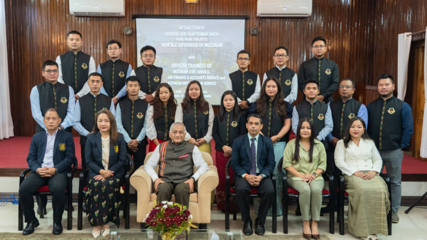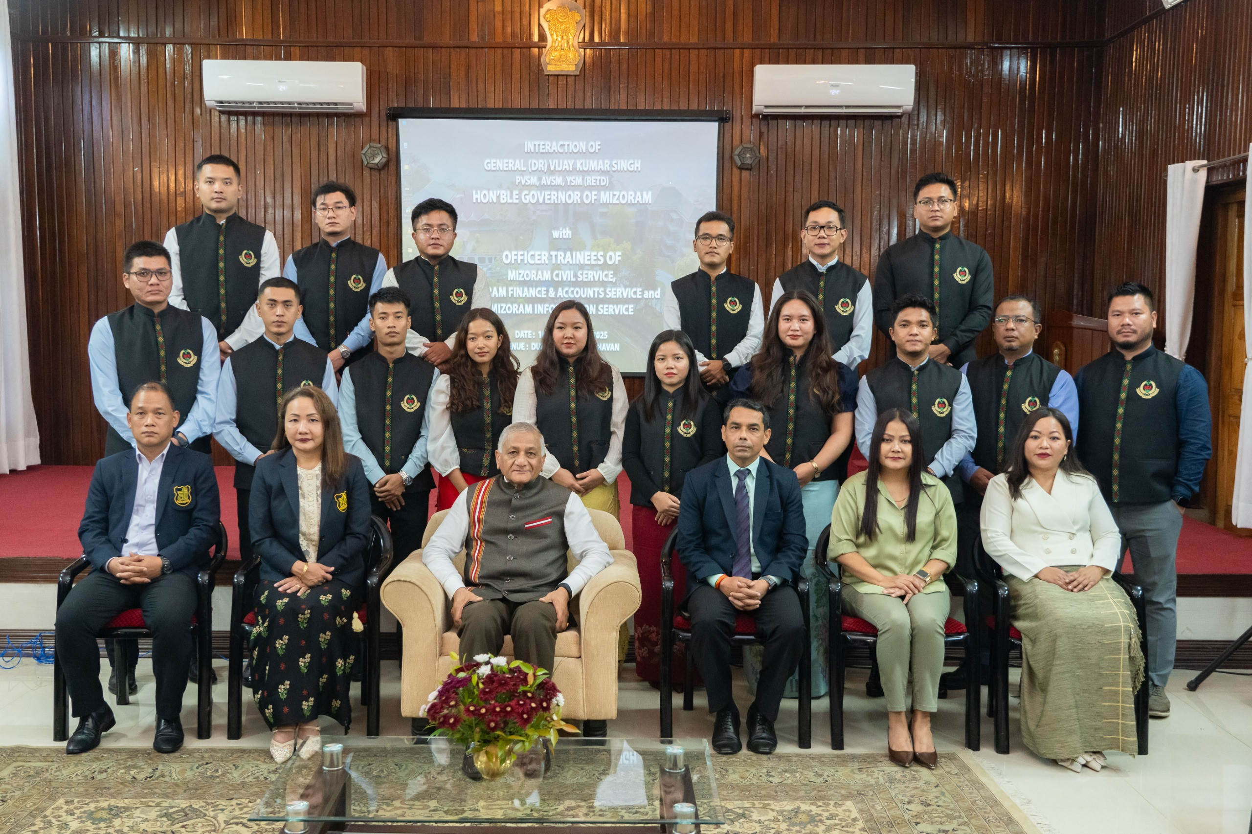 Aizawl, Sept 2025: Thirty-four officer trainees of the Mizoram Civil Service (MCS), Mizoram Information Service (MIS), and Mizoram Finance & Accounts Service (MF&AS), currently undergoing foundation training at the Administrative Training Institute (ATI), MINECO, Aizawl, met Lieutenant General (Dr) Vijay Kumar Singh, PVSM, AVSM, YSM (Retd) at the Durbar Hall, Raj Bhavan today.