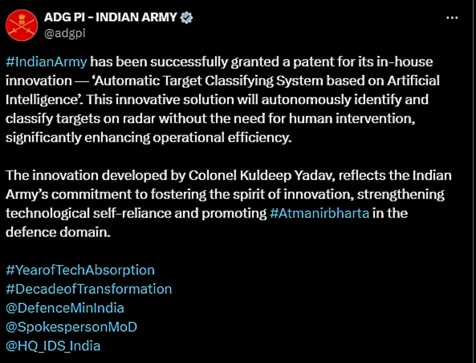 Delhi, Sept 2025 : The Indian Army has locked in a patent for its homegrown “Automatic Target Classifying System based on Artificial Intelligence”, a leap forward in the country’s tactical tech development. Invented & Developed by Colonnel Kuldeep Yadav, the system uses sensors and algorithms to scan radar signals and instantly sort out what’s on the screen, whether it’s aircraft, vehicle, or personnel, without any human assistance.