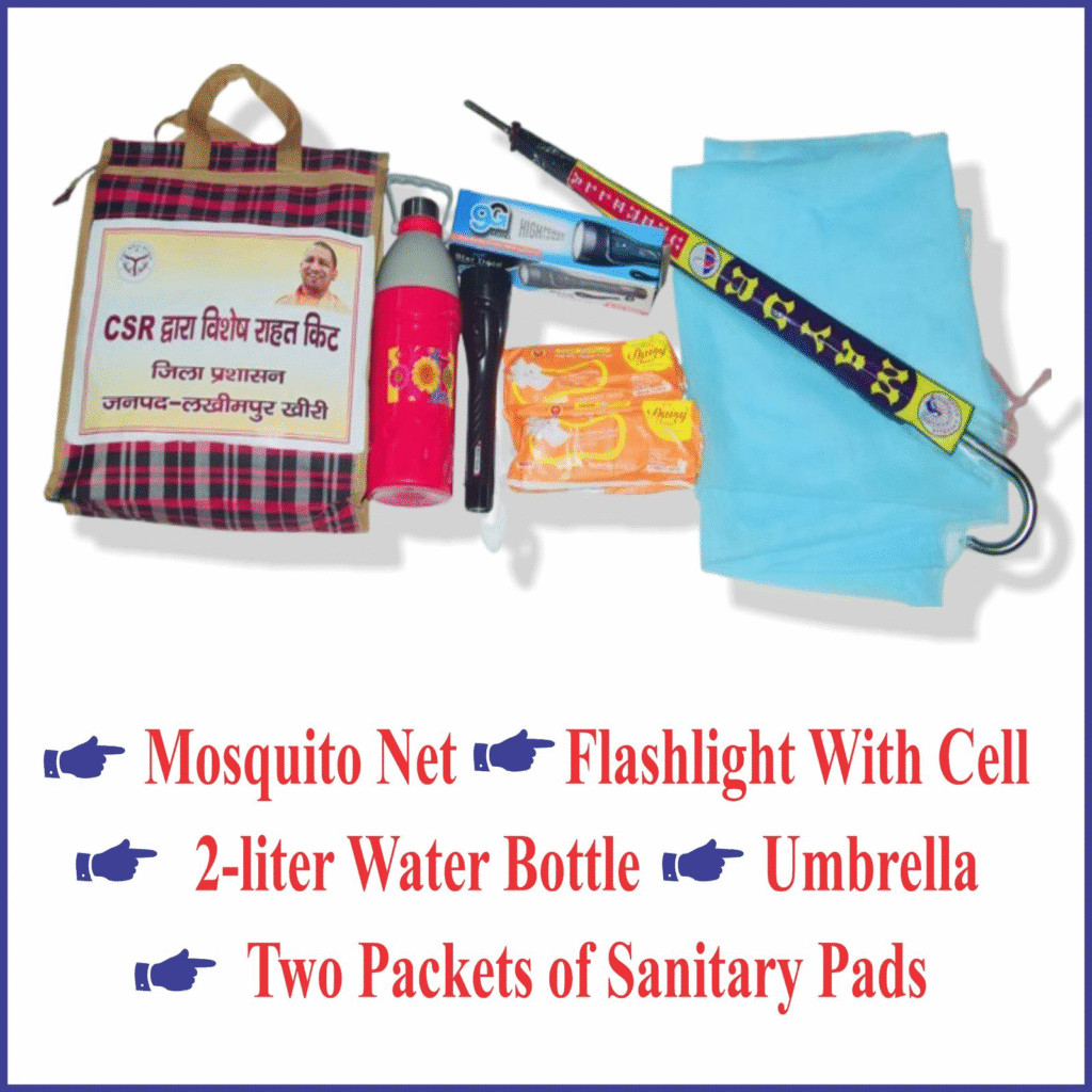 Prepared at a cost of Rs 45 lakh with the support of the corporate sector, entrepreneurs, and voluntary organizations, these kits mark Kheri as the first district in Uttar Pradesh to provide CSR special kits to flood victims. Each kit, worth approximately Rs 900, contains essential items such as a mosquito net, umbrella, battery-operated flashlight, sanitary pads, and a 2-liter hot water thermos. Similar CSR special kits were also distributed last year during floods, under CM Yogi’s guidance.