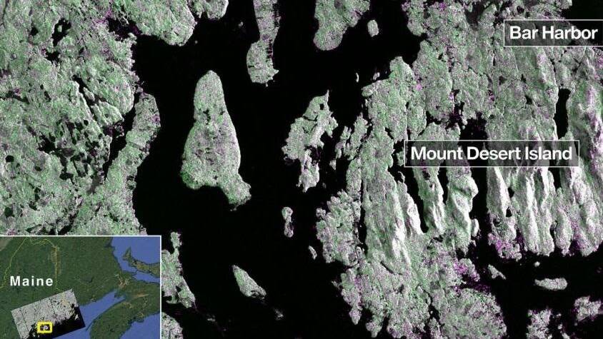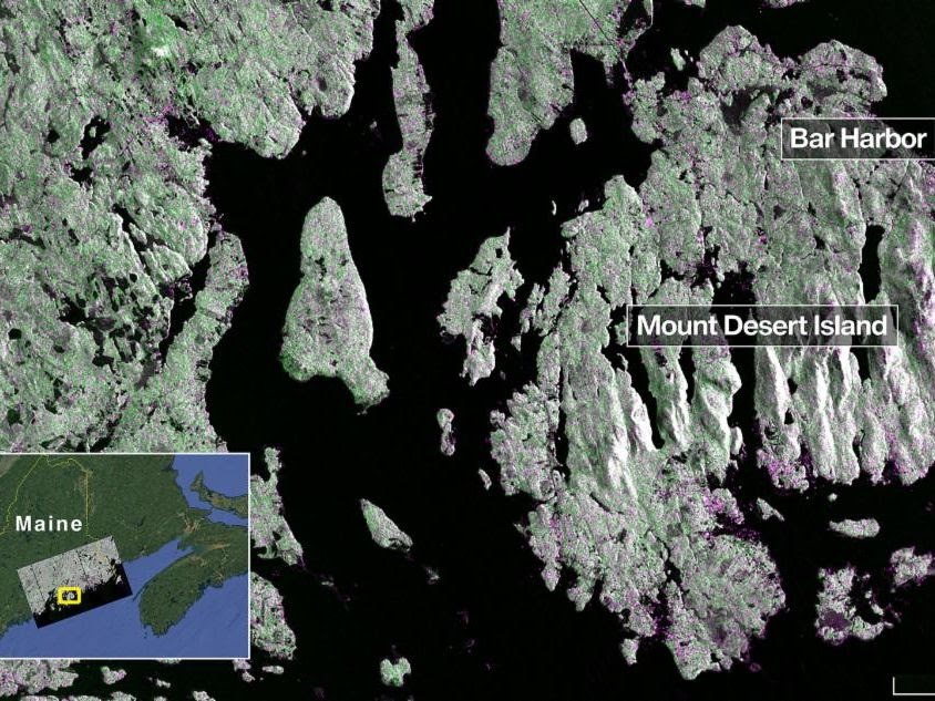 On August 21st, the satellite’s L-band synthetic aperture radar (SAR) system, which was provided by NASA’s Jet Propulsion Laboratory in Southern California, captured Mount Desert Island on the Maine coast. Dark areas represent water, while green areas are forest, and magenta areas are hard or regular surfaces, such as bare ground and buildings. The L-band radar system can resolve objects as small as 15 feet (5 meters), enabling the image to display narrow waterways cutting across the island, as well as the islets dotting the waters around it.