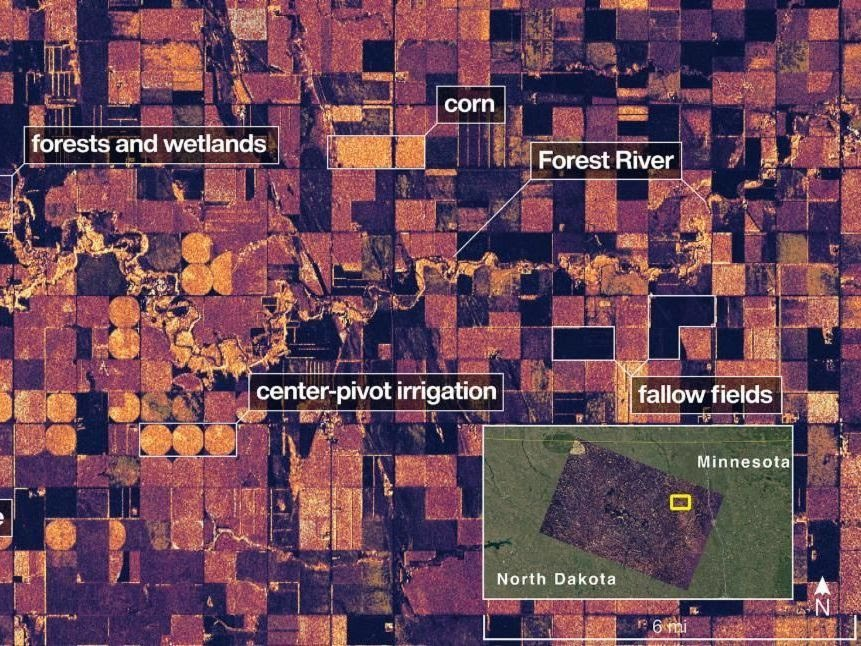 Then, again on 23rd August, the L-band SAR captured data of a portion of north eastern North Dakota straddling Grand Forks and Walsh counties. The image shows forests and wetlands on the banks of the Forest River passing through the centre of the frame from west to east and farmland to the north and south. The dark agricultural plots show fallow fields, while the lighter colours represent the presence of pasture or crops, such as soybean and corn. Circular patterns indicate the use of centre-pivot irrigation. The images demonstrate how the L-band SAR can discern what type of land cover, low-lying vegetation, trees, and human structures are present in each area. This capability is vital both for monitoring the gain and loss of forest and wetland ecosystems, as well as for tracking the progress of crops through growing seasons around the world.