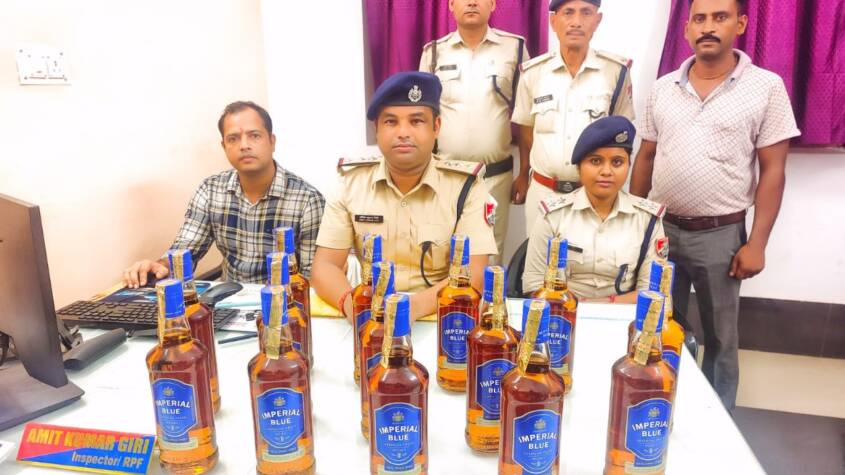 On thorough checking of these bags, a total of 14 bottles of Imperial Blue foreign liquor (750 ml each) were recovered — 07 bottles from the red bag, 05 bottles from the black bag, and 02 bottles from the white bag. The total estimated market value of the recovered liquor is approximately ₹9,100/–.