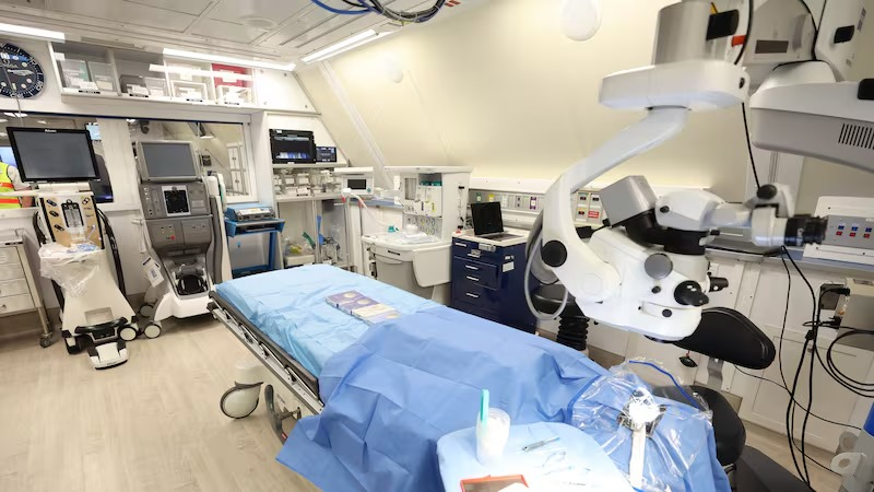 On board the aircraft, 3D-surgical streaming allows medical professionals to experience operations as if looking through a microscope, with real-time feedback and a question-and-answer session for trainees.