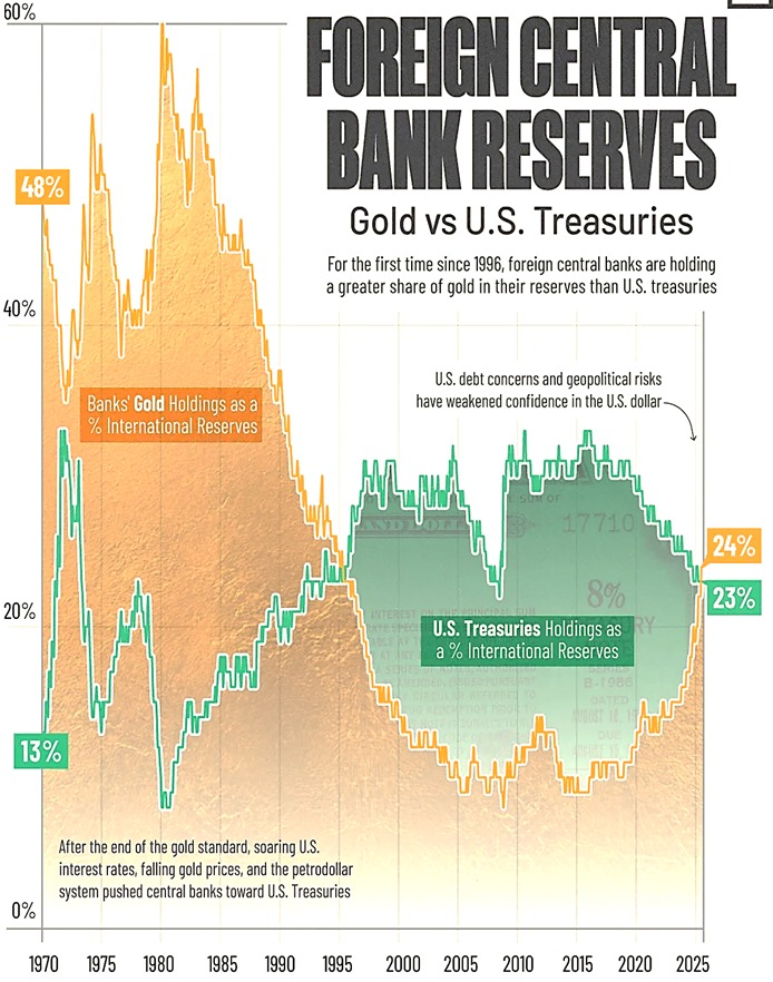 For the first time since 1996, foreign central banks’ gold reserves have overtaken their U.S. Treasury holdings. Persistent gold buying and rising U.S. debt risks are reshaping reserve composition toward hard assets. Central banks have crossed a symbolic line: their combined gold reserves now exceed their U.S. Treasury holdings for the first time in nearly three decades.