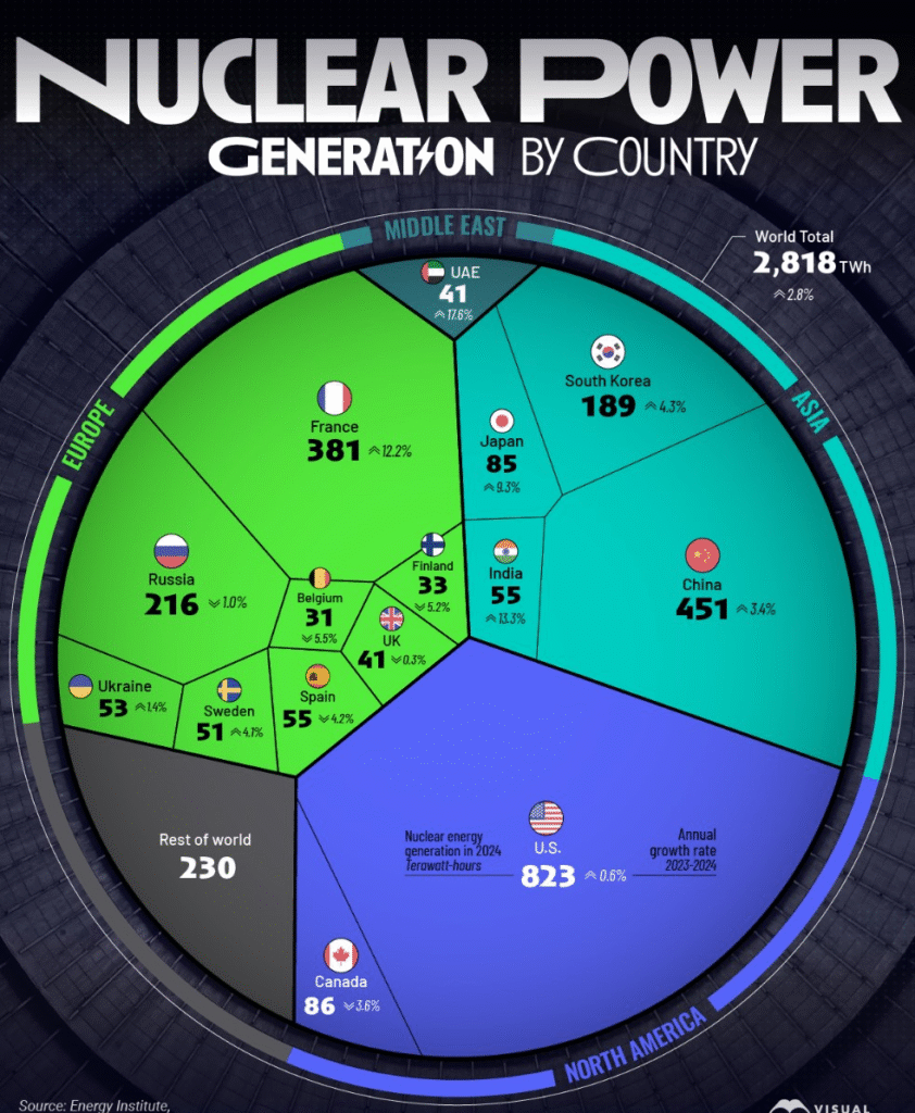 Nuclear power remains one of the world’s largest sources of low-carbon electricity, providing reliable baseload energy for millions of people. In 2024, global nuclear power plants generated 2,818 terawatt-hours (TWh) of electricity, accounting for roughly 10% of the world’s total electricity generation.