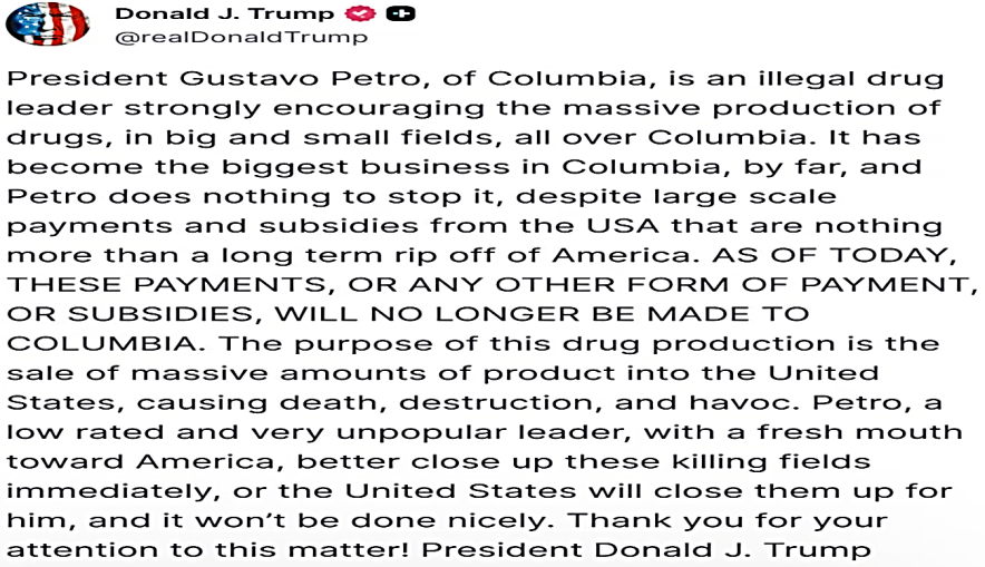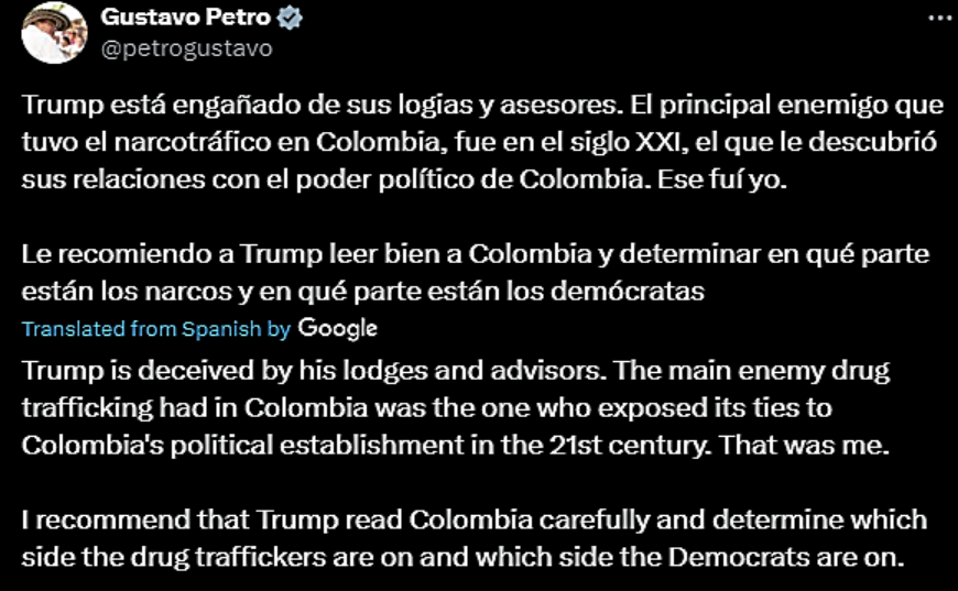Gustavo Petro, the President of Columbia immediately retaliated on his X Handle, saying Trump was being “deceived” by his advisers.