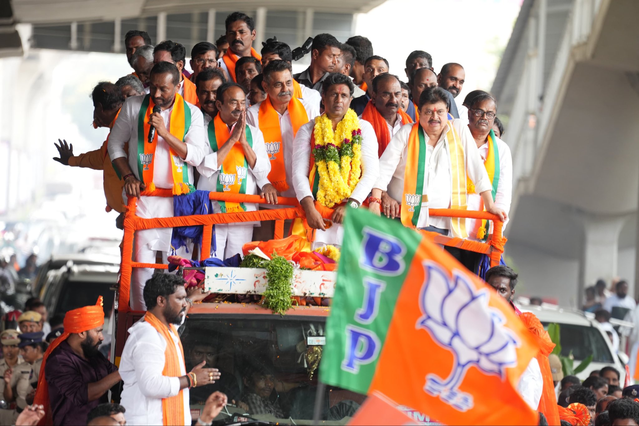 Before filing his nomination, the BJP candidate performed a puja at the Vijayadurga temple in Venkatagiri, joined by Union Minister for Coal and Mines G. Kishan Reddy, Union Minister of State for Home Affairs Bandi Sanjay Kumar, and state BJP president Ramchander Rao. Several leaders, including MP Raghunandan Rao, also participated in the rally.