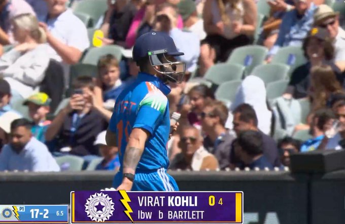 In the seventh over, debutant Xavier Bartlett produced a superb inswinger that struck Kohli flush on the pad. After a brief discussion with Rohit Sharma, the Indian star decided against reviewing the decision. The dismissal capped a clever set-up by Bartlett, who had bowled three deliveries outside off stump before bringing one sharply back in to trap Kohli lbw.