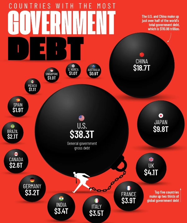 The United States continues to lead with $38.3 trillion in government debt, which accounts for just over one third of the global debt pile.