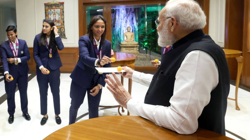Shri Modi then remarked that one particular catch had become very famous. Amanjot Kaur responded that although she had taken many blinders before, none had gained such fame, and it felt good even after fumbling. The Prime Minister said that the catch became a turning point, and after taking it, she must have started seeing the trophy. Amanjot replied that she indeed saw the trophy in that catch, and was overwhelmed by the number of people who jumped on her in celebration.