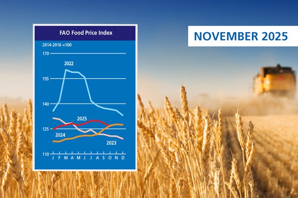 - The FAO Food Price Index (FFPI) averaged 126.4 points in October 2025, down 2.1 points (1.6%) from the revised September level of 128.5 points, marking its second consecutive monthly decline. Lower price indices for cereals, dairy products, meat and sugar outweighed an increase in the vegetable oil index. Overall, the FFPI was slightly below its October 2024 level and remained 33.8 points (21.1%) lower than its peak in March 2022.