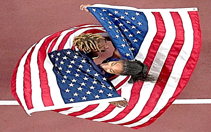 Men’s 100 metres Bronze medalist Noah Lyles of the USA celebrates with his teammate Tara Davis Woodhall, Gold medalist from the Women’s long jump, at the World Athletics Championships Tokyo 25.