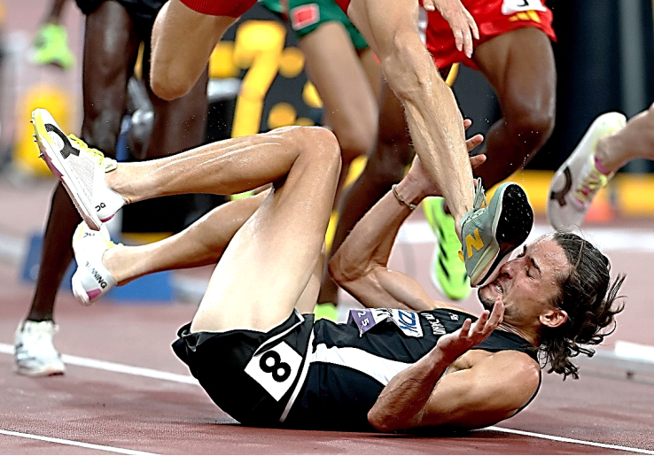Geordie Beamish of New Zealand avoids the foot of Jean-Simon Desgagnes of Canada as he falls on the ground during the men’s 3000 metres Steeplechase heats on day one of the World Athletics Championships Tokyo 25.