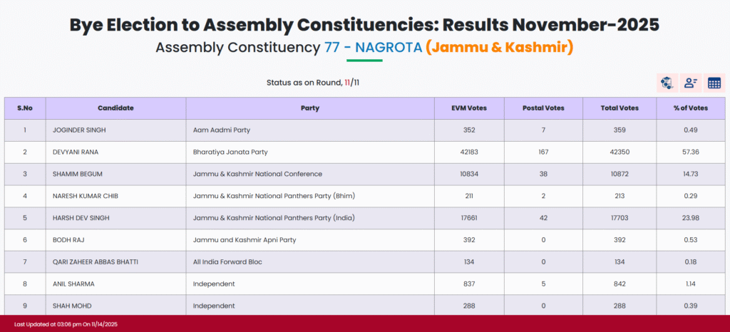 Jammu, Nov 2025 : Bharatiya Janata Party (BJP) candidate Devyani Rana on Friday secured a decisive victory in the Nagrota Assembly bypoll in Jammu and Kashmir, defeating her nearest rival, Harsh Dev Singh of the J&K National Panthers Party (JKNPP), by a margin of over 21,000 votes.
