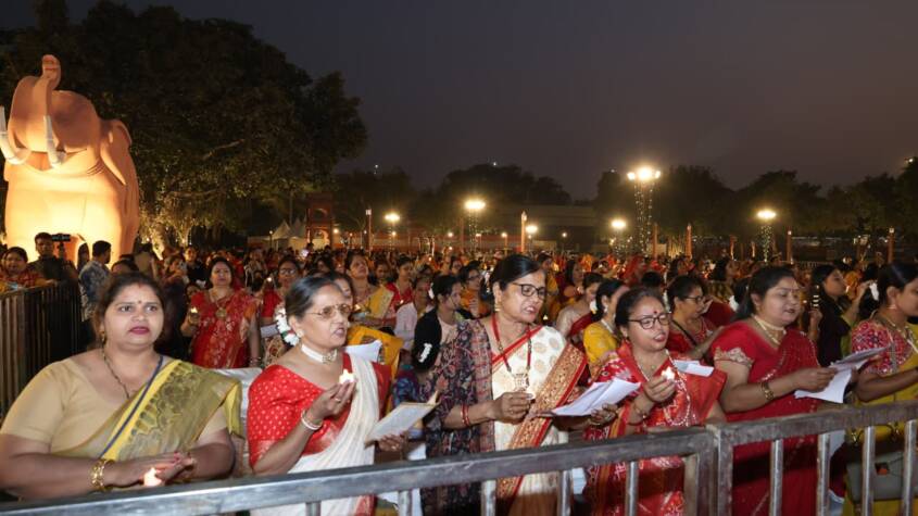New Delhi, Nov 2025 : A remarkable and divine scene unfolded today at Vasudev Ghat on the banks of the Yamuna near Kashmere Gate. Under the leadership of Delhi Chief Minister Smt. Rekha Gupta, thousands of women gathered along the sacred riverbank to chant the Mahishasura Mardini Stotram. Through their strong and resonant collective recitation, they sent out a clear message that no terrorist, extremist, or anti-national force attempting to intimidate Delhi can ever succeed in frightening either the city or the nation.