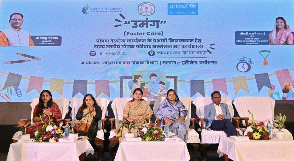 Raipur, Nov 2025 : A state-level foster family conference and workshop was successfully organised at Hotel Marriott Courtyard, Raipur, under the joint auspices of the Department of Women and Child Development and UNICEF, with the objective of strengthening the “Umang—Foster Care” programme. The aim of this initiative is to make the foster care system more effective, sensitive, and inclusive so that children living in institutional care can receive a safe, loving, and family-like environment.