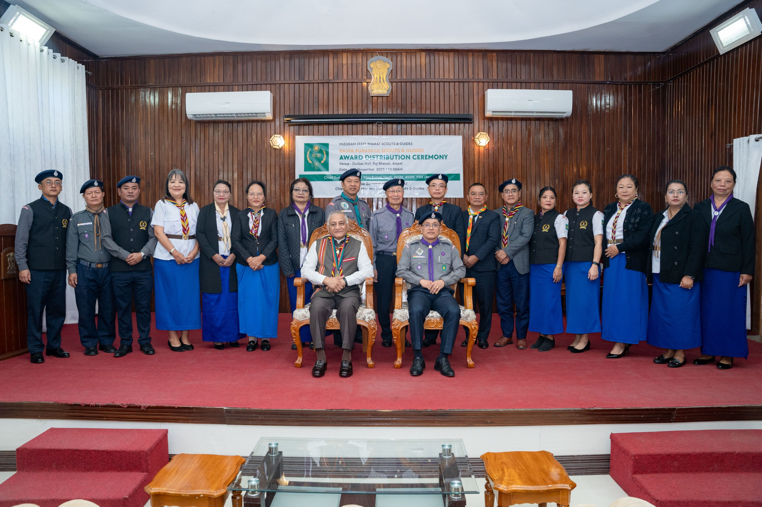 Aizawl, Nov 2025: Mizoram Governor General (Dr) Vijay Kumar Singh, PVSM, AVSM, YSM (Retd), today presented the prestigious Rajya Puraskar Award (Governor’s Award) – the highest state-level honour conferred by the Mizoram Bharat Scouts & Guides (MBS&G)- to selected Scouts and Guides during a formal ceremony held at Durbar Hall, Raj Bhavan, Aizawl.