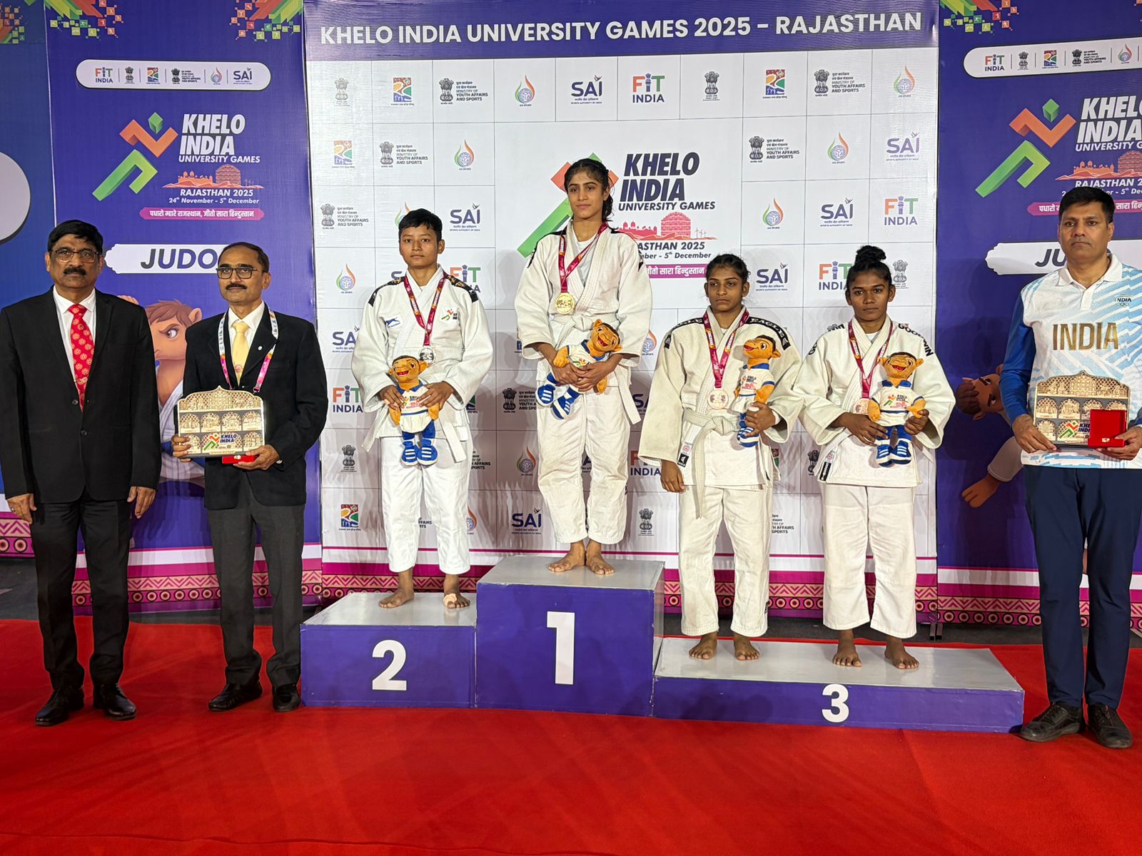 During the medal ceremony, Sports Authority of India Director Amit Singh, Rajasthan Judo Association Secretary Mahipal Grewal, Devasthan Department Additional Commissioner Gitesh Malviya, and SU Sports Council Secretary Dr. Bhimraj Patel honored the medal winners.