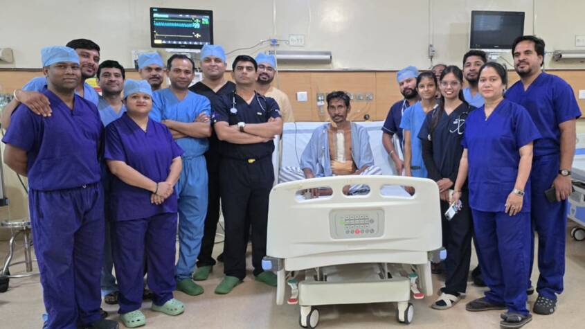 A 40-year-old man from the Maharashtra border region was brought to the hospital’s trauma unit in critical condition after sustaining a gunshot wound. Under the leadership of Dr. Krishnakant Sahu, the heart surgery team removed the bullet that had penetrated the right ventricle after passing through the tricuspid valve via the right atrium—successfully saving the patient’s life in this highly complicated case.