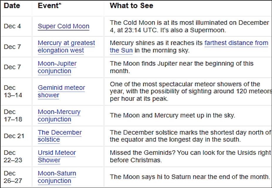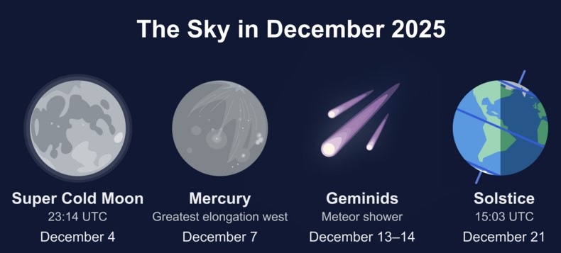 Nov 2025 : The last month of 2025, December brings many wonderful celestial events. In the Northern Hemisphere, nights are at their darkest, though daylight gradually increases after the December solstice. In the Southern Hemisphere, the solstice ushers in summer and long, bright evenings. No matter wherever on Earth, December offers plenty to look forward to, including a major meteor shower, brilliant Mercury, and several planetary close encounters involving the Moon.
