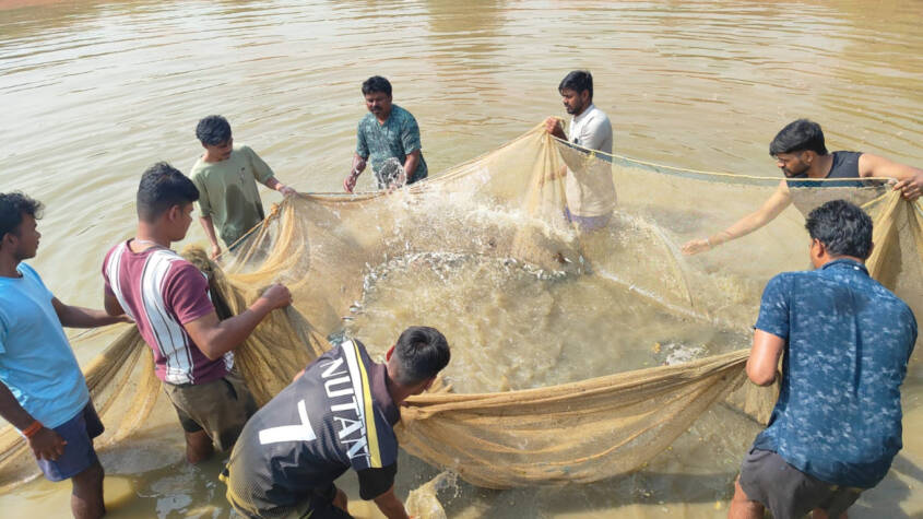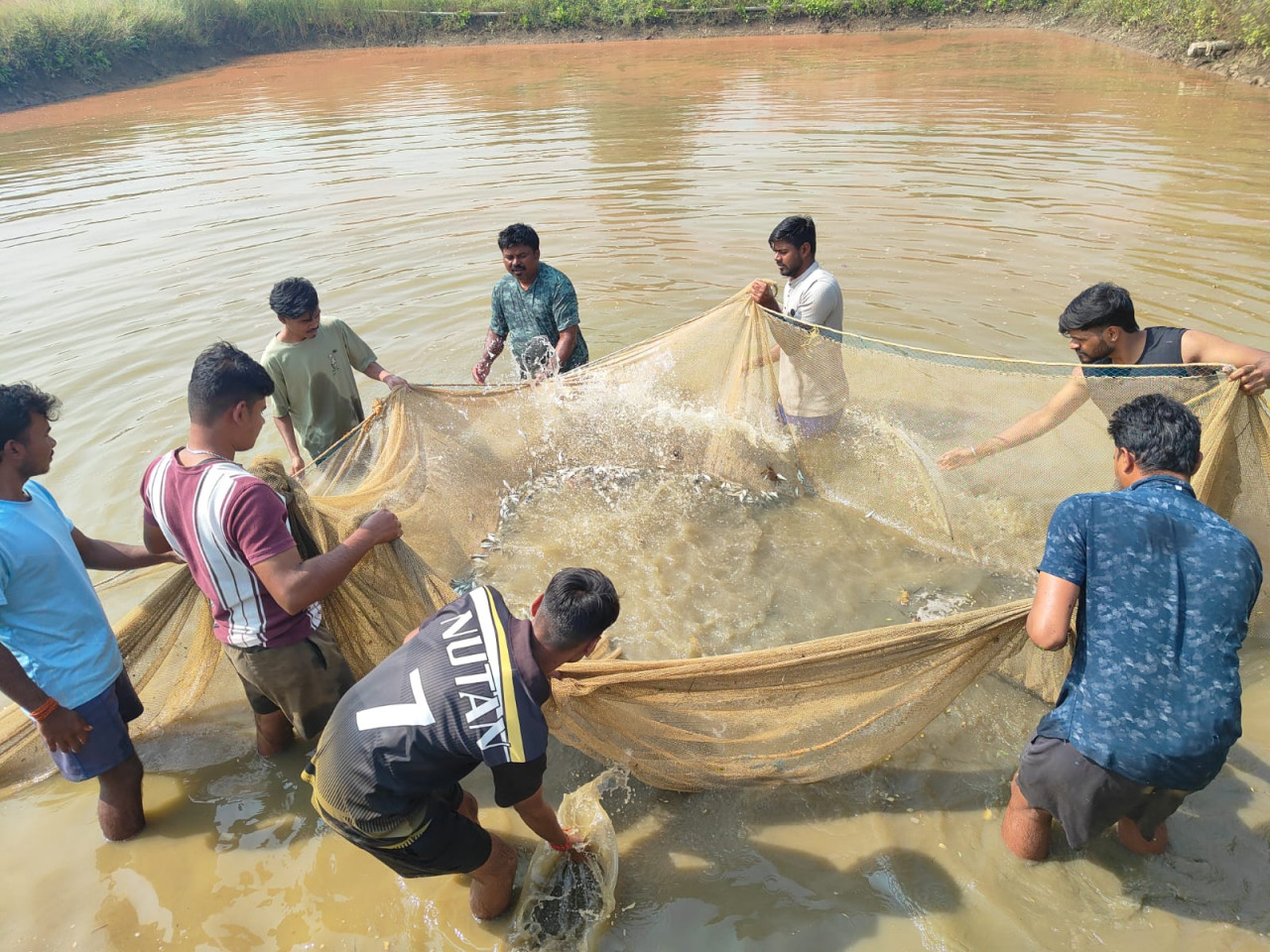 On the second day, Dr. S. Sasmall and Dr. Ankit Thakur conducted field training on the practical aspects of mixed fish farming. Demonstrations were given on pond selection, fish seed stocking, manure management, natural food production, and other practical techniques.