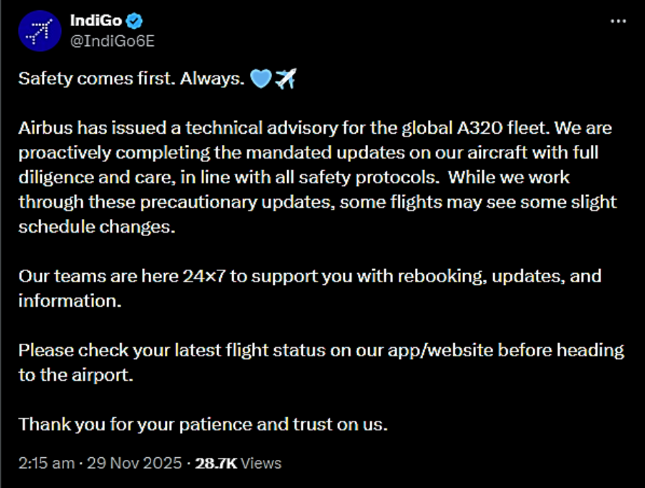 In a separate post on X, IndiGo emphasised that “safety comes first” and confirmed it is carrying out the mandated updates across its A320 aircraft “with full diligence and care, in line with all safety protocols“.