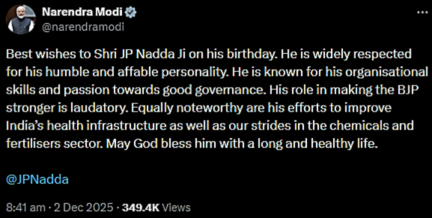 December 2025: Prime Minister Narendra Modi extended warm birthday wishes to Bharatiya Janata Party (BJP) National President JP Nadda on Tuesday, praising his humility, organisational strength and commitment to good governance. He described Nadda’s contribution to strengthening the BJP as “laudatory” and highlighted his work in improving India’s health infrastructure as well as the chemicals and fertilisers sectors.