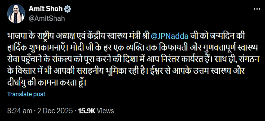 Union Home Minister Amit Shah also extended his birthday greetings, commending Nadda’s role in expanding the BJP and advancing affordable healthcare.