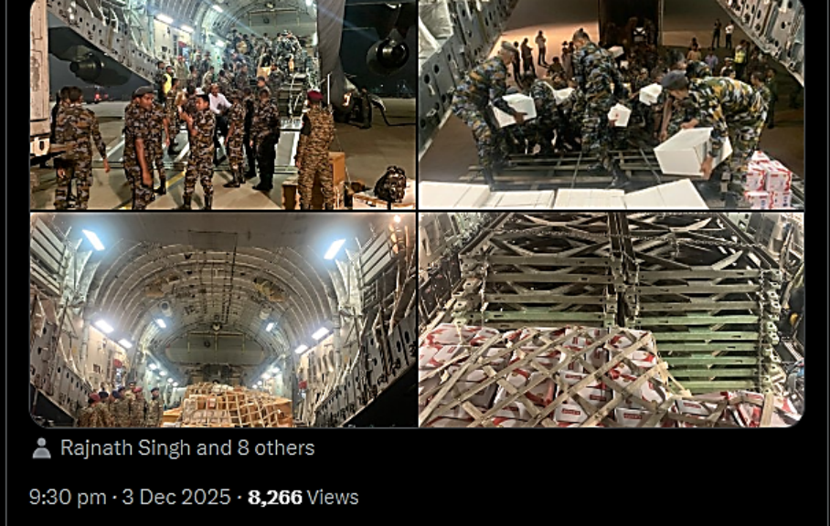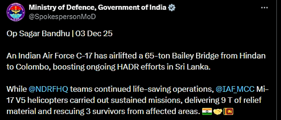 “An Indian Air Force C-17 has airlifted a 65-ton Bailey Bridge from Hindan to Colombo, boosting ongoing HADR efforts in Sri Lanka. While NDRF teams continued life-saving operations, Indian Air Force Mi-17 V5 helicopters carried out sustained missions, delivering 9 T of relief material and rescuing 03 survivors from affected areas“. The Ministry of Defence said in a post on X.