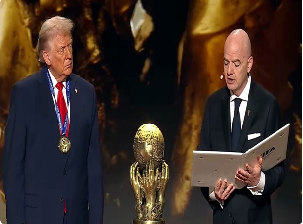 Washington; December 2025: US President Donald Trump has been given the inaugural FIFA Peace Prize at the 2026 World Cup draw in Washington. FIFA President Gianni Infantino awarded Trump moments before teams were assigned their tournament groups.