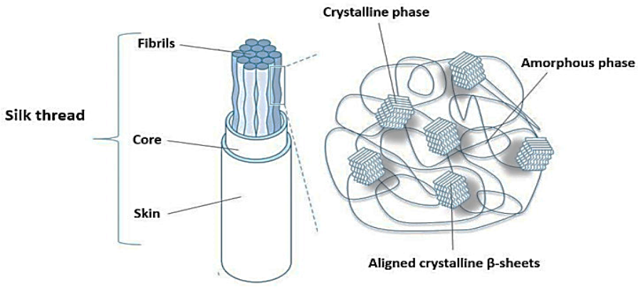 The microstructure of silk fibres is semi-crystalline, as shown in the below-depicted figure, due to the presence of two phases: crystalline and amorphous (non-crystalline), as shown in. The nanocrystalline phase is a result of the specific polypeptide secondary structure. Namely, in places with a high concentration of the amino acid alanine (polyalanine regions), several antiparallel β-sheets will form and group. These sheets are networked in an amorphous phase rich in glycine. Weak hydrogen bonds are responsible for the superiority of this biopolymer in terms of its mechanical properties. SEM and AFM imaging revealed that the silk thread (with a diameter of 4–5 μm) consists of many silk fibres with diameters in a range of 40–80 nm.