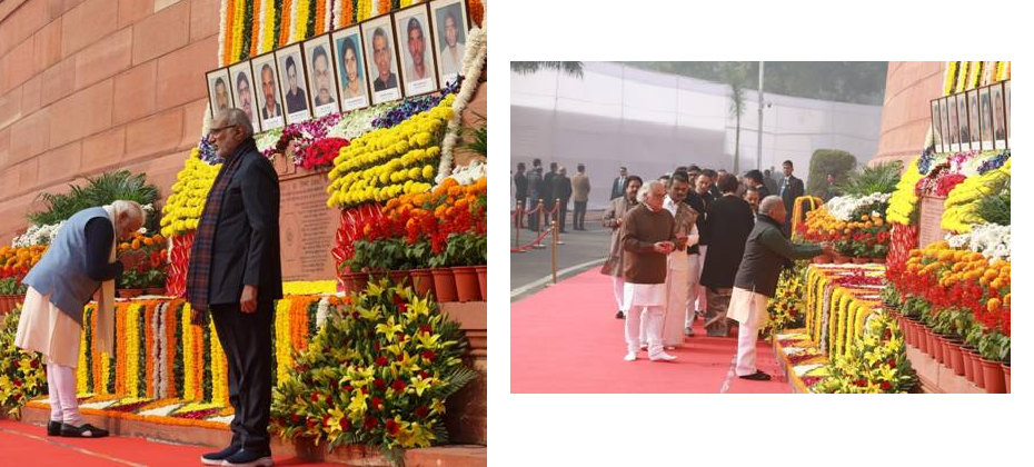 Vice-President and Chairman, Rajya Sabha, Shri C P Radhakrishnan; Prime Minister Shri Narendra Modi; Union Ministers; Leader of Opposition, Shri Rahul Gandhi; Deputy Chairman, Rajya Sabha Shri Harivansh, Members of Parliament, former Members of Parliament and other dignitaries paid tributes to the martyrs. Secretary-General, Lok Sabha, Shri Utpal Kumar Singh; Secretary-General, Rajya Sabha, Shri P. C. Mody and family members of the martyrs also paid tributes.