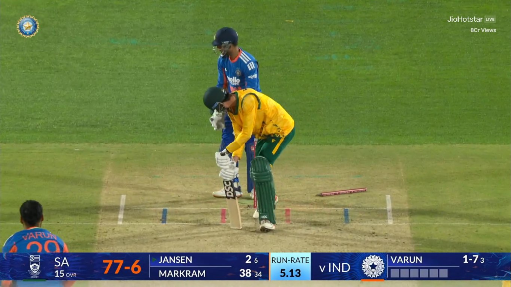 South Africa’s struggles deepened when Hardik Pandya claimed his 100th T20I wicket by dismissing Tristan Stubbs for 9, leaving the Proteas reeling at 30 for 4. Amid the collapse, captain Aiden Markram stood firm, playing a lone hand of substance. His fighting 61 off 46 balls, which included six fours and two sixes, provided some respectability to the total. Donovan Ferreira chipped in with 20, while Anrich Nortje added 12 down the order, but support was largely absent.