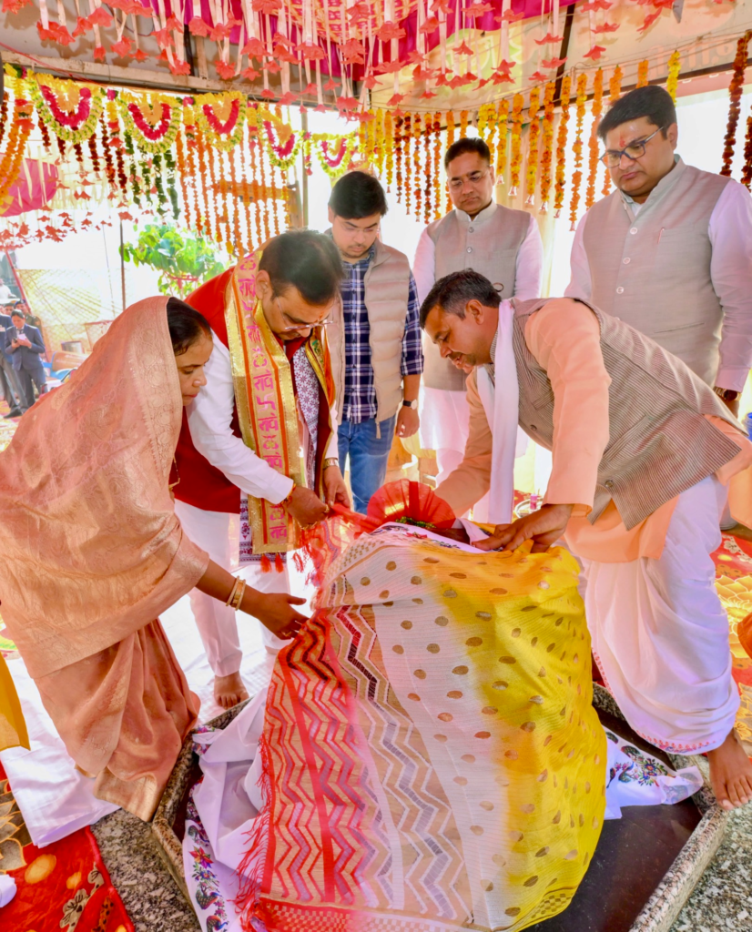 Jaipur, December 2025: On the occasion of completing two years in office, Chief Minister Bhajanlal Sharma visited the Mukut Mukharavind Temple in Lautha, Poonchri, in the Dungarpur district on Monday. He performed the ceremonial worship of Shri Giriraj Ji and offered prayers for the prosperity of the state and the well-being of the people.