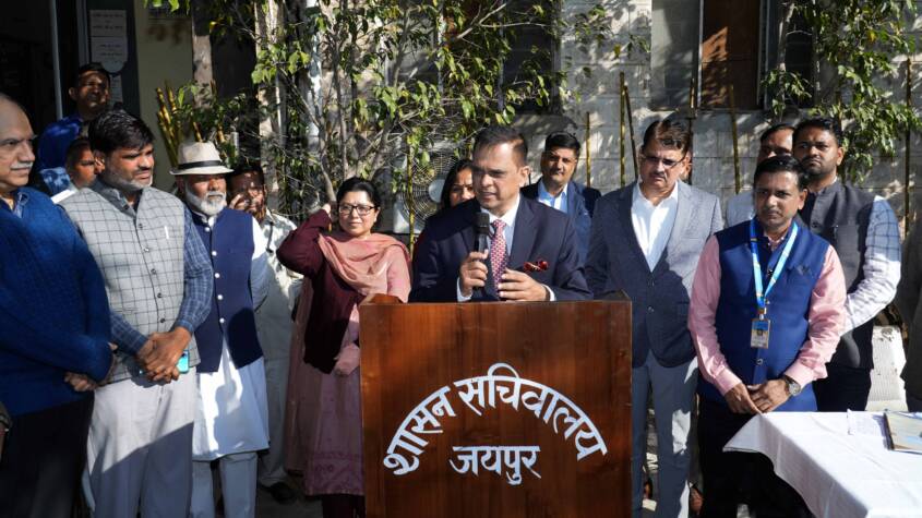Jaipur, Dec 2025: A cleanliness campaign was organized at the State Secretariat on Tuesday to mark the completion of two years of the state government’s tenure. The drive was inaugurated near the Employees’ Union Canteen within the Secretariat premises, where Chief Secretary V. Srinivas, along with senior officials and staff, participated by sweeping and cleaning the area.