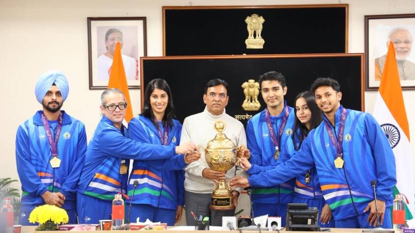 Sports Minister Dr. Mansukh Mandaviya felicitates Indian Squash Team after maiden World Cup triumph in Chennai