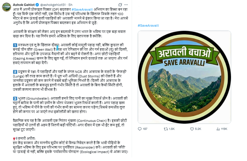 Jaipur; December 2025: Former Rajasthan Chief Minister Ashok Gehlot on Thursday expressed support for the #SaveAravalli campaign, changing his social media display picture (DP) to show solidarity. He said that this was not just a symbolic change of photo but a protest against the new definition under which hills shorter than 100 meters are no longer recognised as part of the Aravalli range. In a post shared on X, Gehlot warned that these changes regarding Aravalli conservation pose a major threat to the future of North India. He urged citizens to change their display pictures as well to join the campaign.