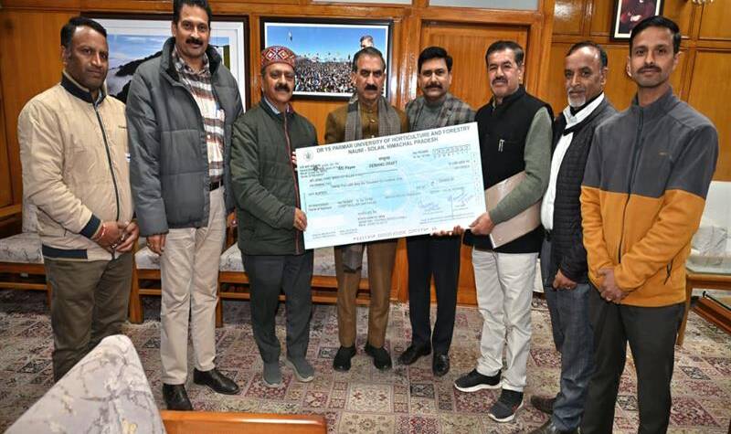 Vice Chancellor of Dr. Y.S. Parmar University of Horticulture and Forestry, Nauni, Prof. R.S. Chandel presented a cheque of Rs. 25,66,606 to Chief Minister Thakur Sukhvinder Singh Sukhu towards the Chief Minister Relief Fund as contribution of one day salary of staff of the University here today.
