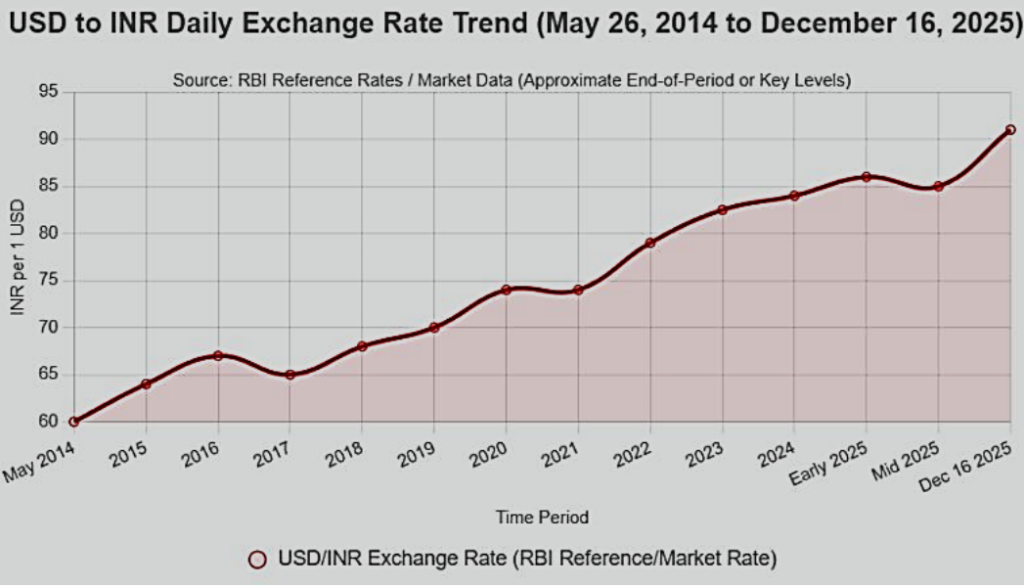 New Delhi; December 2025: In early December 2025, the Indian rupee fell past the important 90 mark against the US dollar for the first time. It has dropped to intraday lows above 90.38 before closing near that level on December 17th, as the Reserve Bank of India (RBI) suggests. Although official reports say the rupee is still one of the least volatile emerging-market currencies, it has lost about 6.14% of its value this year. This continues a longer-term decline.