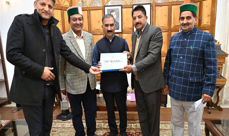 Chief Minister Thakur Sukhvinder Singh Sukhu was presented a Coffee Table Book by Chairman of Himachal Pradesh State Co-operative Bank Devendra Shyam here today.